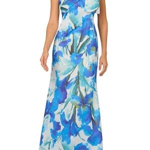 Betsy and Adam White Royal Print Georgina Draped Cowl Neckline Spaghetti Straps Cascading Ruffle Details Back Zipper Flowy Skirt Floor Length Dress