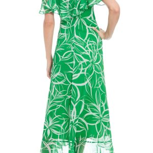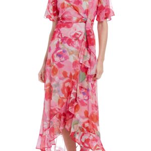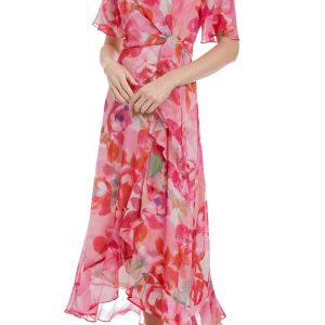 London Times Floral Print Surplice V-Neck Short Sleeves Ruffled High-Low Hem Faux-Wrap Silhouette Chiffon Maxi Dress