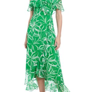 London Times Floral Ruffled Cold-Shoulder Wrap Spaghetti Thin Straps Tiered Hem Maxi Length