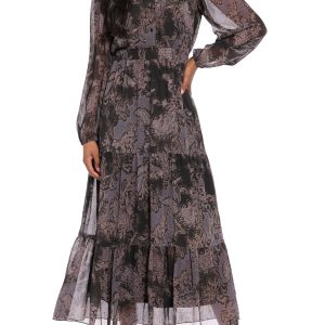 London Times Collared Buttoned Ruffle Neckline Long Bishop Elastic Cuff Sleeves Fit Bodice Smocked Waistband Fit-and-Flare Tiered Maxi Dress