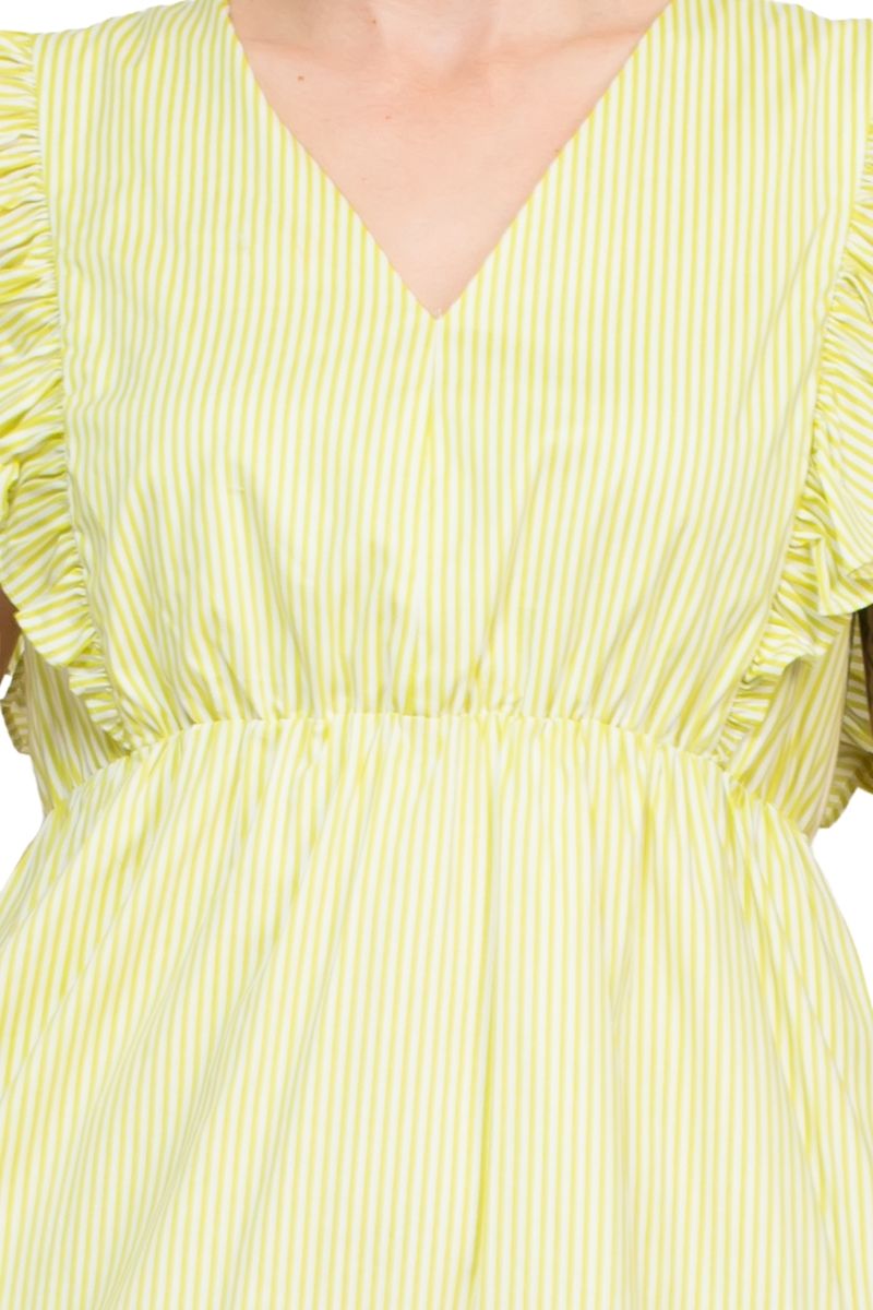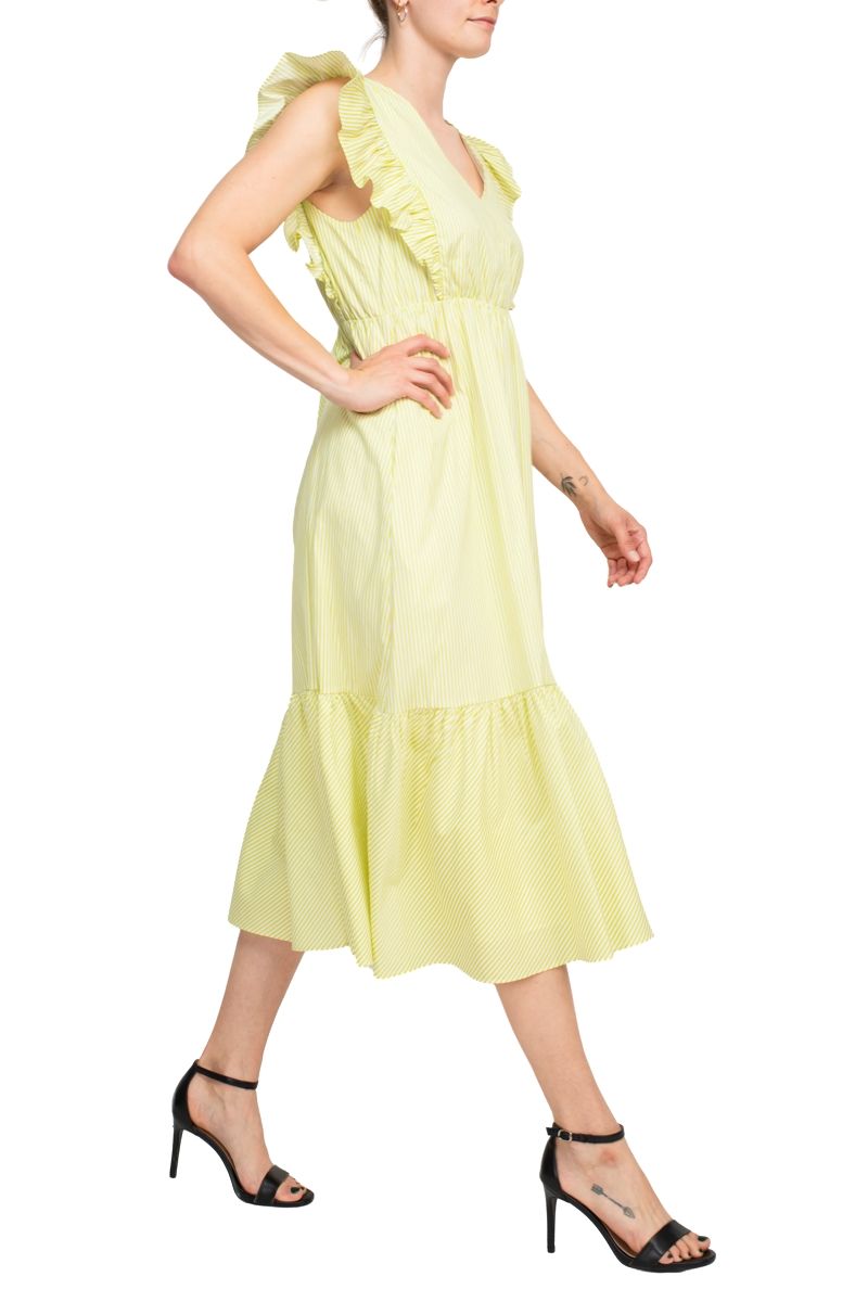 Crafted from a luxurious shell of cotton (96% Cotton. 4% Spandex). this dress offers a soft and breathable feel against your skin. perfect for warm-weather occasions. The subtle stripes add a touch of timeless elegance. while the ruffle detailing creates a playful and feminine silhouette.