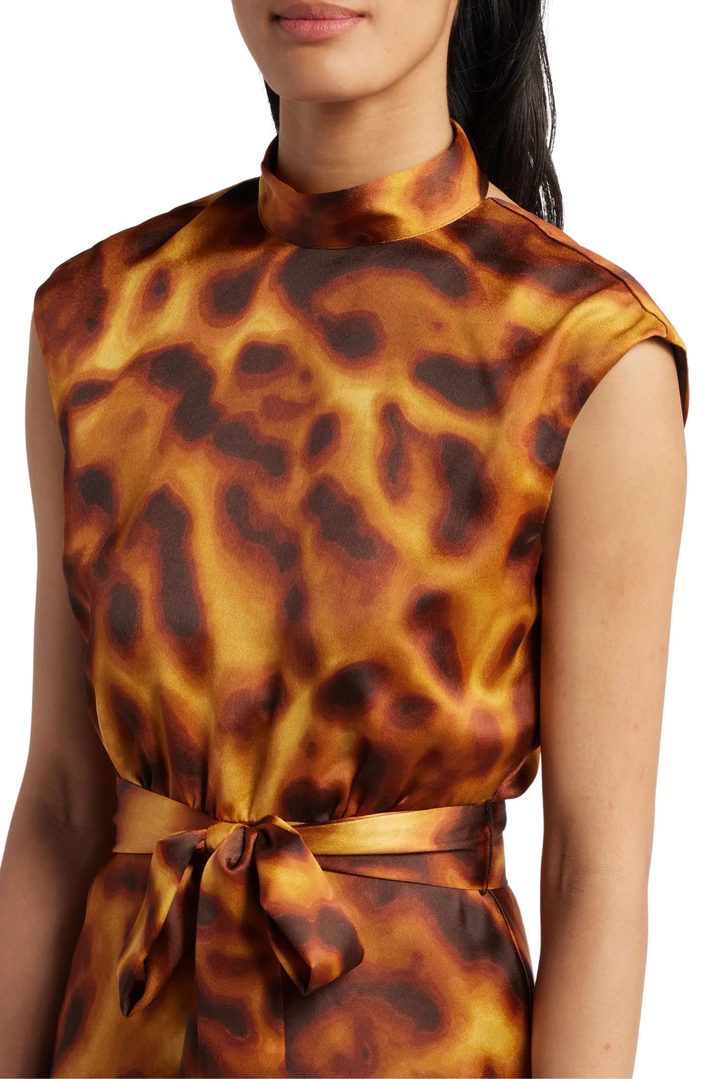 Make an unforgettable impression with the Tahari ASL Satin Print Sleeveless Mock Neck Midi Dress. a refined yet effortlessly stylish choice for daytime receptions. elegant dinner parties. and seamless day-to-evening transitions. This exquisite A-line dress is designed to exude grace with its flowing silhouette and luxurious satin fabric.