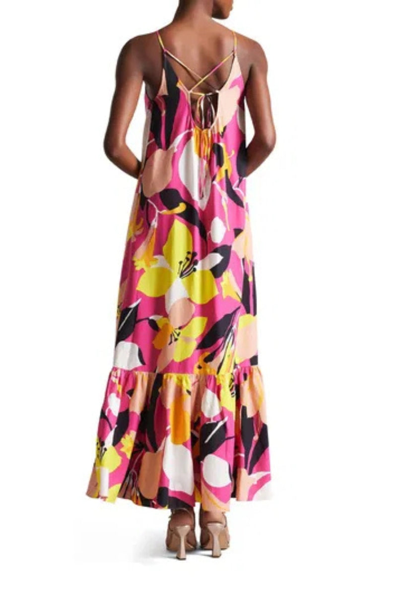 Hutch Vibrant Print Sweetheart Smocked Bustier Bodice Adjustable Tie Straps Accordion-Pleated Skirt Maxi Dress